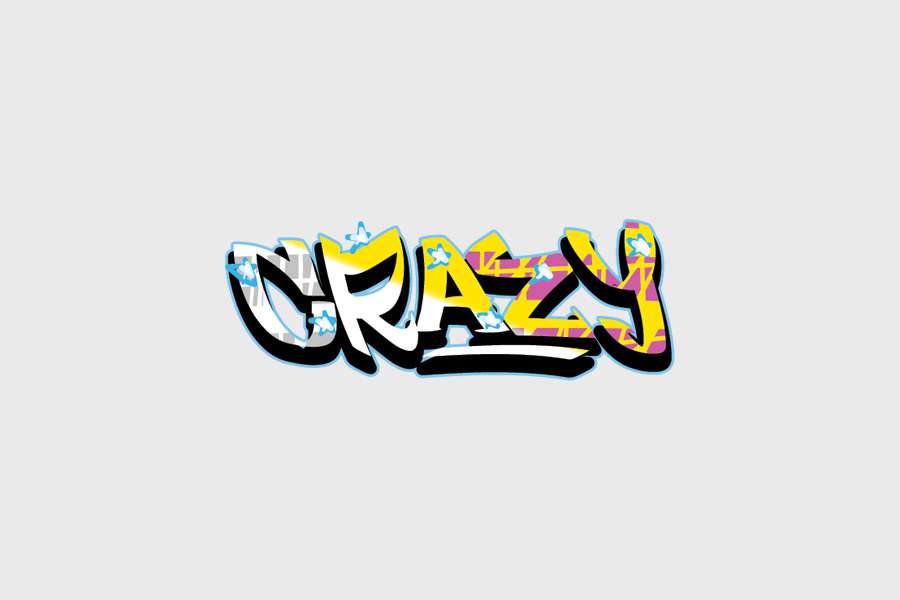 Αυτοκόλλητο τοίχου από βινύλιο που απεικονίζει τη λέξη "CRAZY" σε χρωματισμούς λευκού, γκρι, κίτρινου γαλάζιου και ροζ, με γραφή που παραπέμπει σε γκράφιτι.