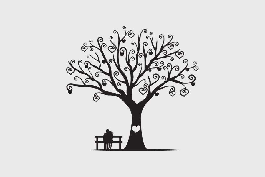 Αυτοκόλλητο τοίχου από βινύλιο που απεικονίζει ένα δέντρο με καρδιές αντί για φύλλα. Έχει επίσης μια καρδιά στον κορμό και στη βάση του υπάρχει ένα παγκάκι με ένα ζευγάρι.