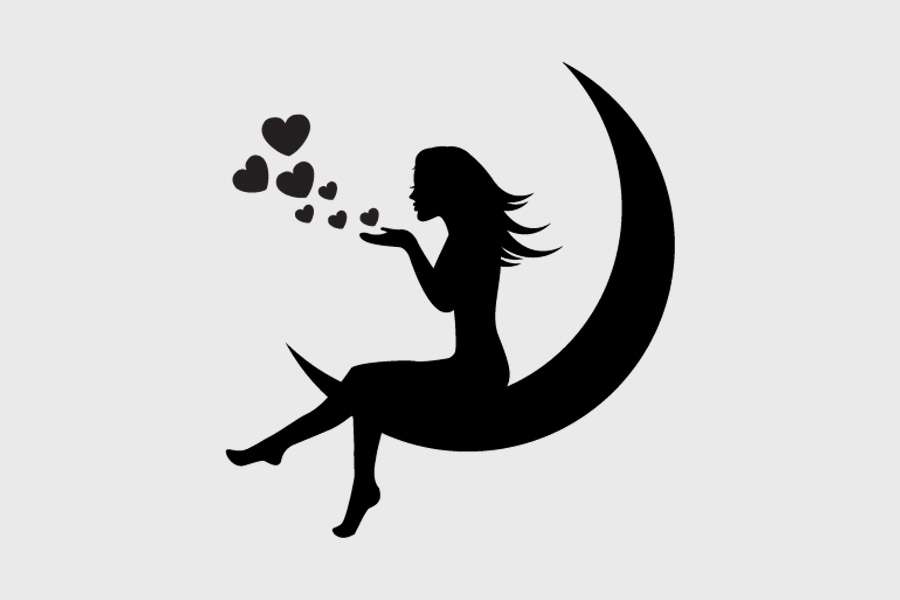 Αυτοκόλλητο τοίχου από βινύλιο που απεικονίζει μια κοπέλα πάνω σε ένα μισοφέγγαρο και με καρδούλες στα χέρια.