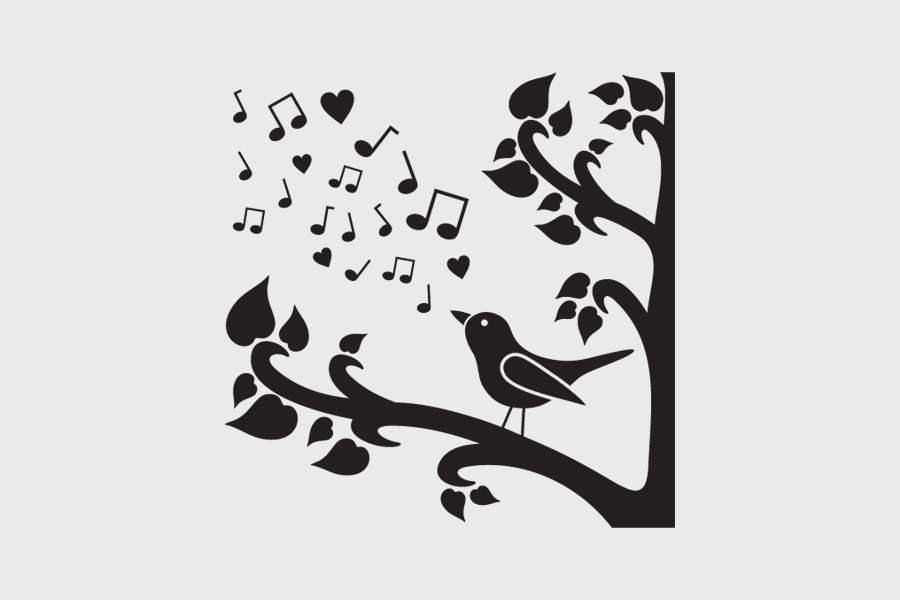 Αυτοκόλλητο τοίχου από βινύλιο που απεικονίζει ένα δέντρο με φύλλα σε σχήμα καρδιάς, με ένα ωδικό πτηνό και νότες.