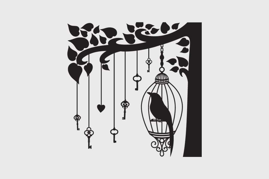 Αυτοκόλλητο τοίχου από βινύλιο που απεικονίζει μισό κορμό δέντρου και κλαδί με φύλλα σε σχήμα καρδιάς, με ένα ωδικό πτηνό σε κλουβί και κλειδιά.