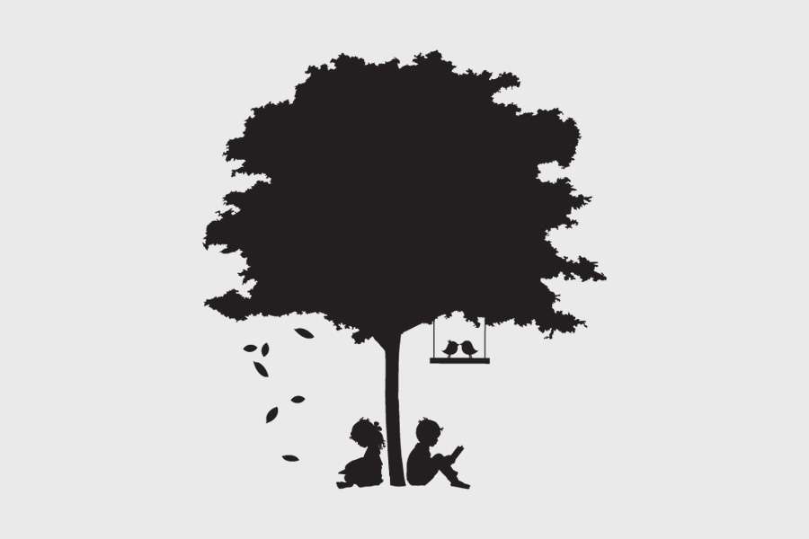 Αυτοκόλλητο τοίχου από βινύλιο που απεικονίζει ένα δέντρο με πυκνό φύλλωμα με δύο παιδιά να κάθονται δίπλα στον κορμό και μια κούνια με δύο πουλιά.