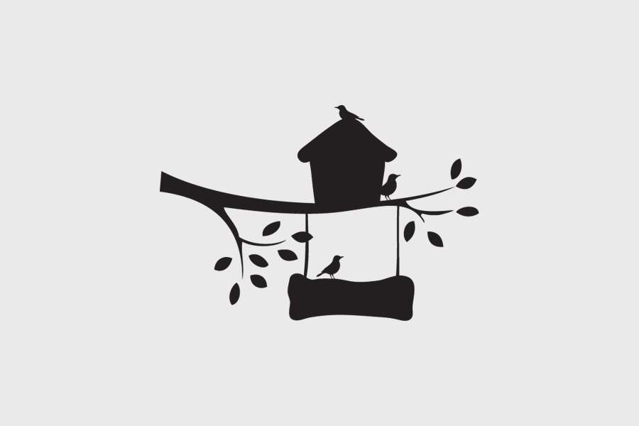 Αυτοκόλλητο τοίχου από βινύλιο που απεικονίζει ένα κλαδί με φύλλα, ένα σπιτάκι φωλιά για πουλιά, μια κούνια και τρία πουλιά.