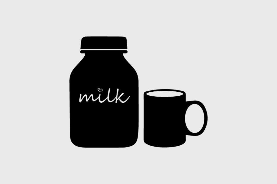 Αυτοκόλλητο τοίχου από βινύλιο που απεικονίζει μια συσκευασία γάλα με τη λέξη "MILK" σε λευκό πάνω και μια κούπα.