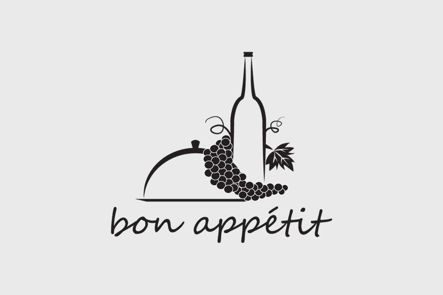 Αυτοκόλλητο τοίχου από βινύλιο που απεικονίζει ένα μπουκάλι, μια καμπάνα φαγητού με σταφύλια ενδιάμεσα. Στη βάση υπάρχει το λεκτικό "Bon appetit" .