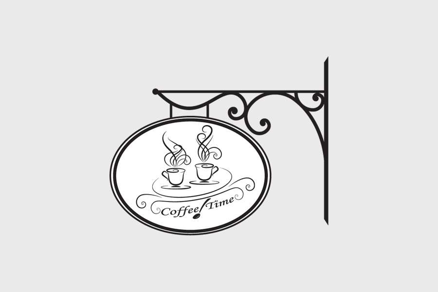 Αυτοκόλλητο τοίχου από βινύλιο που απεικονίζει μια πινακίδα με γωνιακή στύριξη με θέμα δύο φλύτζάνια που αχνίζουν με τη φράση "Coffee Time" στη βάση και ένα κουτάλι ανάμεσα στις λέξεις .