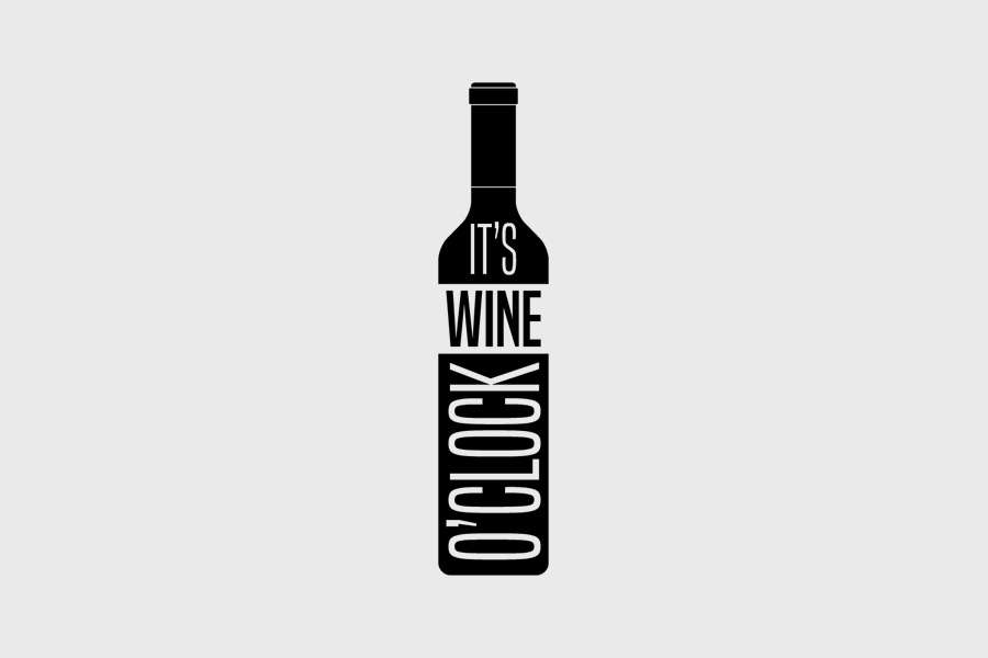 Αυτοκόλλητο τοίχου από βινύλιο που απεικονίζει τη φράση "It's wine o'clock" σε σχήμα μπουκαλιού.