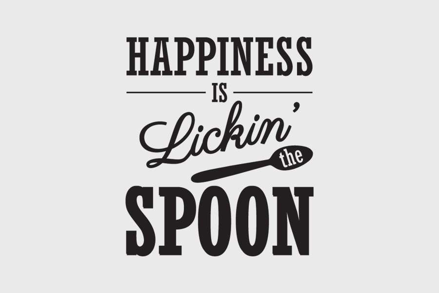 Αυτοκόλλητο τοίχου από βινύλιο που απεικονίζει τη φράση "Happiness is lickin' the spoon". Η λέξη "the" είναι μέσα σε σχήμα κουταλιού .