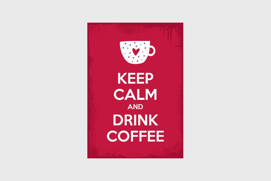 Αυτοκόλλητο τοίχου από βινύλιο που απεικονίζει ένα κόκκινο πλαίσο σε κόκκινο χρώμα με μία λευκή κούπα με το σχήμα καρδιάς επάνω και τη φράση "Keep calm and drink coffee".