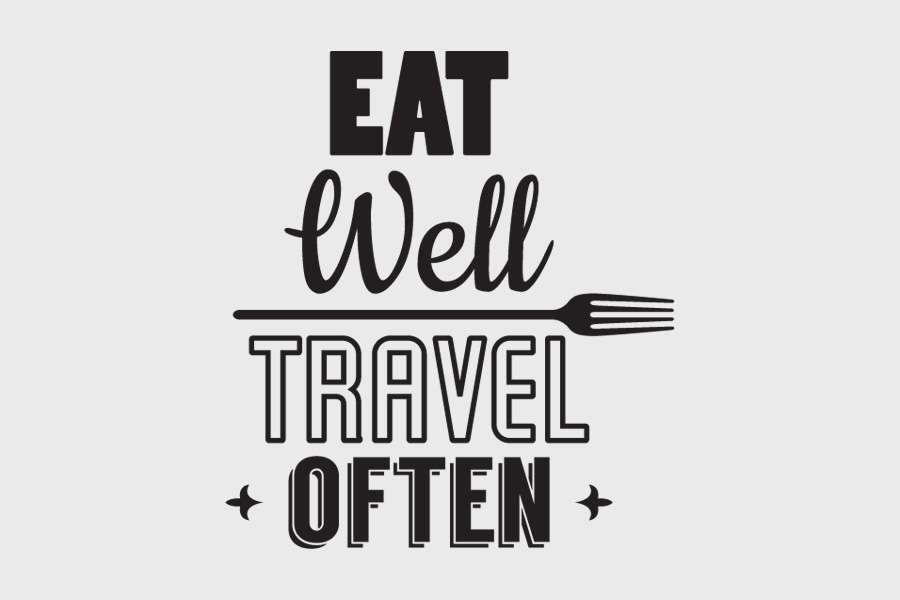 Αυτοκόλλητο τοίχου από βινύλιο που απεικονίζει τη φράση "Eat well travel often". Στη μέση υπάρχει το σχήμα από ένα πιρούνι.