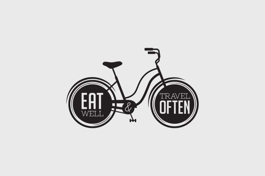 Αυτοκόλλητο τοίχου από βινύλιο που απεικονίζει ένα ποδήλατο που στις ρόδες του έχει τη φράση "Eat well & travel often".