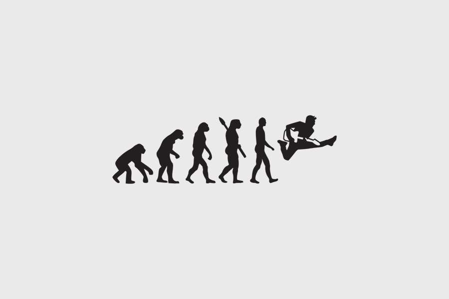 Αυτοκόλλητο τοίχου από βινύλιο που απεικονίζει την εξέλιξη του ανθρώπου με κατάληξη έναν μουσικό στον αέρα, που παίζει ηλεκτρική κιθάρα.