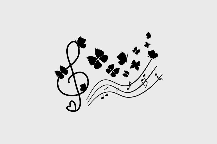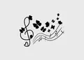 Αυτοκόλλητο τοίχου από βινύλιο που απεικονίζει το κλειδί του σολ μαζί με νότες πάνω σε γραμμές πενταγράμμου και πεταλούδες.