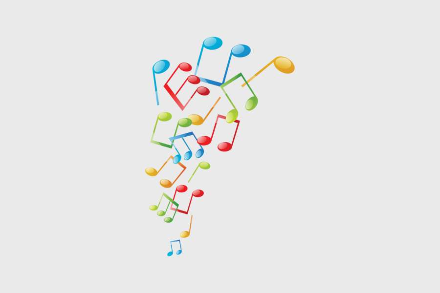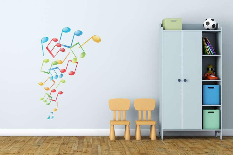 Αυτοκόλλητο τοίχου από βινύλιο που απεικονίζει διάφορες νότες σε διάφορα χρώματα σε σχήμα που παραπέμπει σε πηγή ήχου.