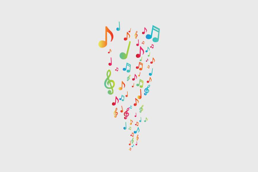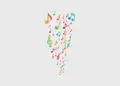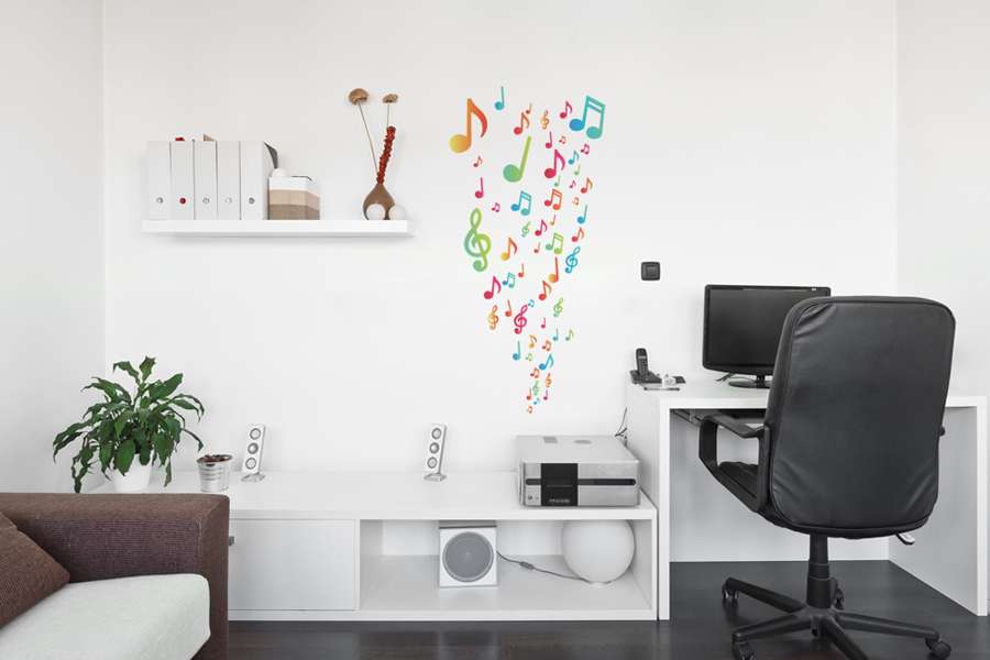 Αυτοκόλλητο τοίχου από βινύλιο που απεικονίζει διάφορες νότες σε διάφορα χρώματα σε σχήμα που παραπέμπει σε πηγή ήχου.