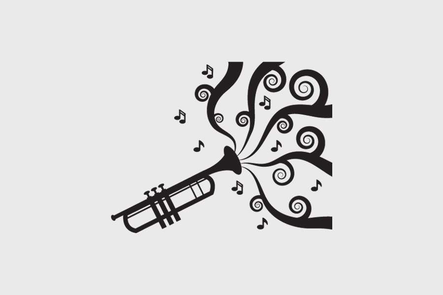 Αυτοκόλλητο τοίχου από βινύλιο που απεικονίζει μια τρομπέτα με νότες και ένα σχέδιο που παραπέμπει σε μουσική, να βγαίνουν από μπροστά.