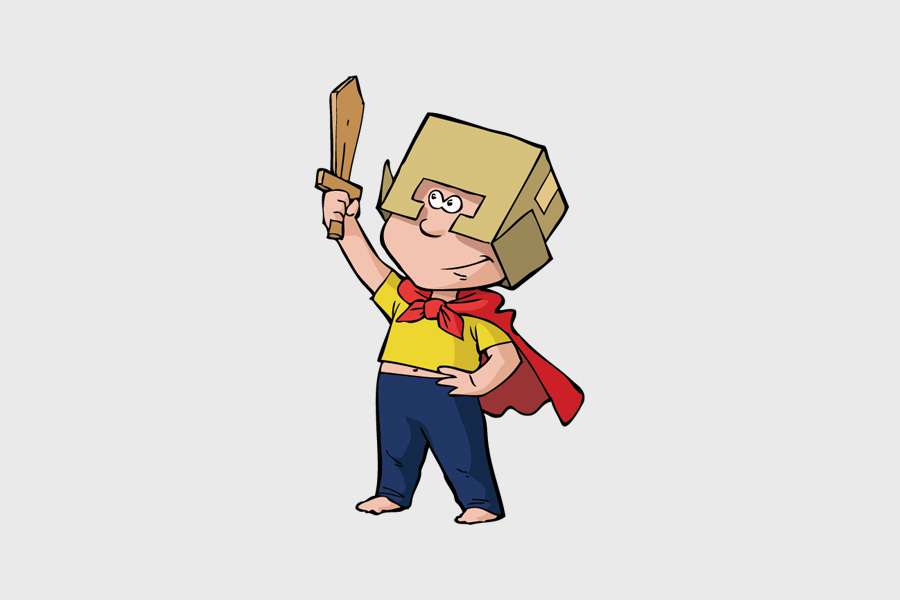 Αυτοκόλλητο τοίχου από βινύλιο που απεικονίζει ένα παιδί να κάνει τον ιππότη με ένα χαρτόκουτο για κράνος και ένα ξύλινο σπαθί.