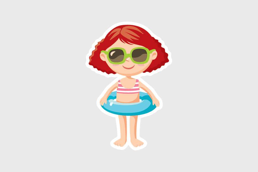 Αυτοκόλλητο τοίχου από βινύλιο που απεικονίζει ένα κοριτσάκι με μαγιό και σωσίβιο, σε λευκό περίγραμμα.