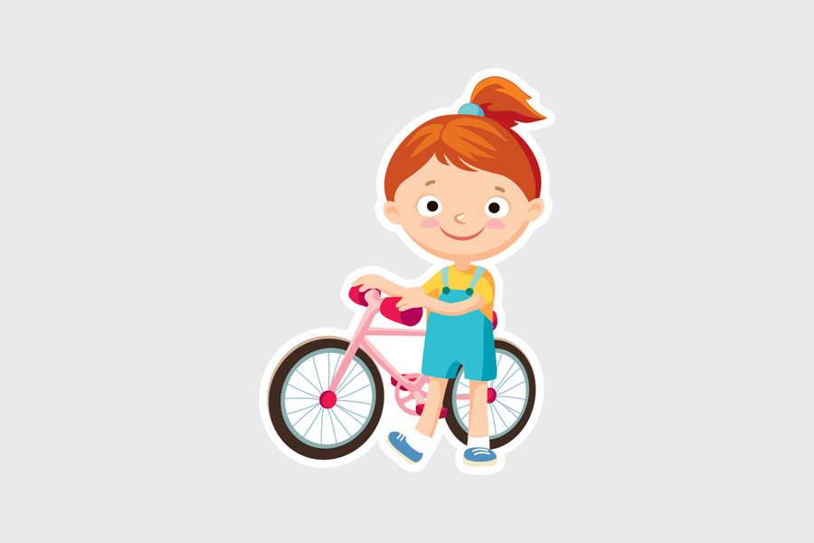 Αυτοκόλλητο τοίχου από βινύλιο που απεικονίζει ένα κοριτσάκι μαζί με ένα ποδήλατο, σε λευκό περίγραμμα.