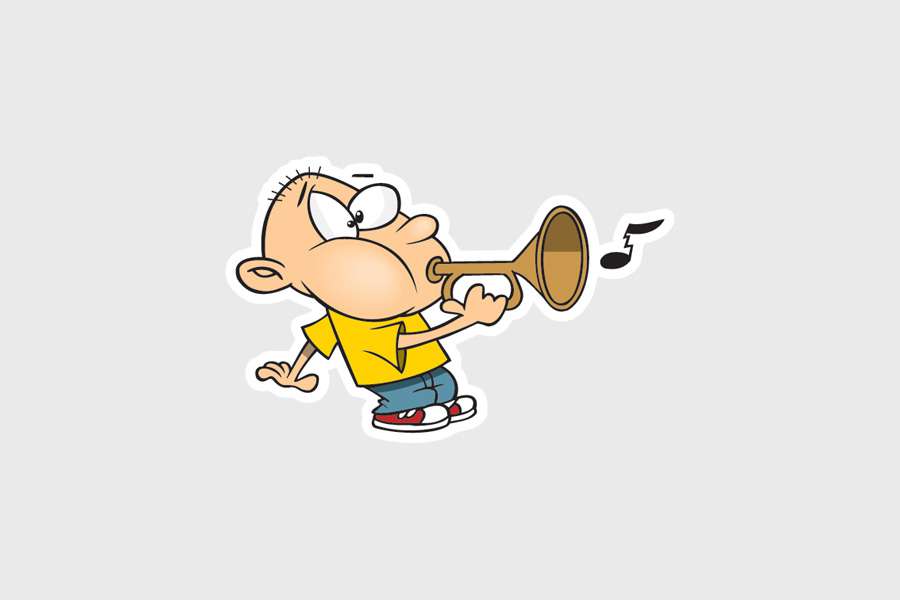 Αυτοκόλλητο τοίχου από βινύλιο που απεικονίζει ένα αγοράκι που παίζει τρομπέτα, σε λευκό περίγραμμα.
