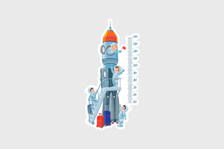 Αυτοκόλλητο τοίχου από βινύλιο, υψομετρητής, που απεικονίζει ένα διαστημικό πύραυλο και αστροναύτες, σε λευκό περίγραμμα.