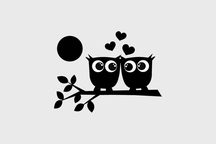 Αυτοκόλλητο τοίχου από βινύλιο που απεικονίζει σιλουέτες από δύο κουκουβάγιες πάνω σε ένα κλαδί με φύλλα κάτω από το φεγγάρι.