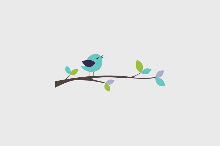 Αυτοκόλλητο τοίχου από βινύλιο που απεικονίζει ένα πουλάκι με μπλε και πράσινα χρώματα πάνω σε ένα καφέ κλαδί με πράσινα και μωβ φύλλα.