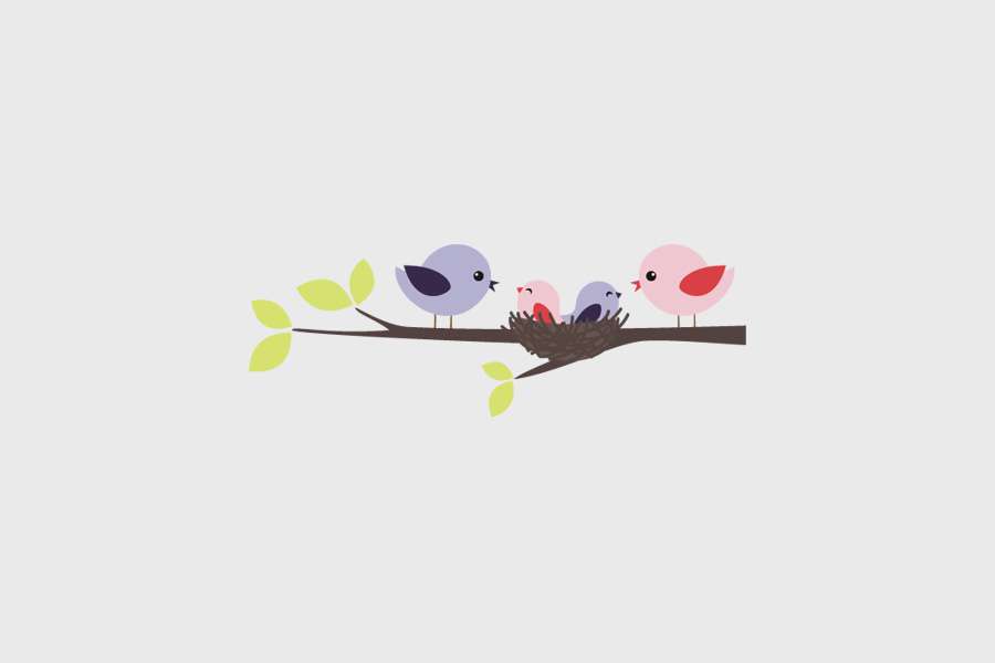 Αυτοκόλλητο τοίχου από βινύλιο που απεικονίζει δύο πουλάκια με μοβ και ροζ χρώματα πάνω σε ένα καφέ κλαδί με πράσινα φύλλα μαζί με μια φωλιά με δύο μικρά πουλάκια μέσα.