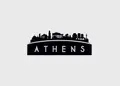 Αυτοκόλλητο τοίχου από βινύλιο που απεικονίζει σημεία της πόλης της Αθήνας και με το λεκτικό "ATHENS" σε μαύρο φόντο.