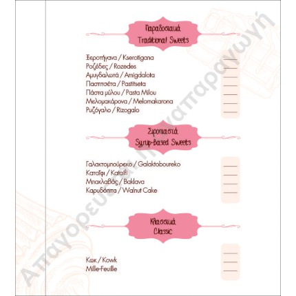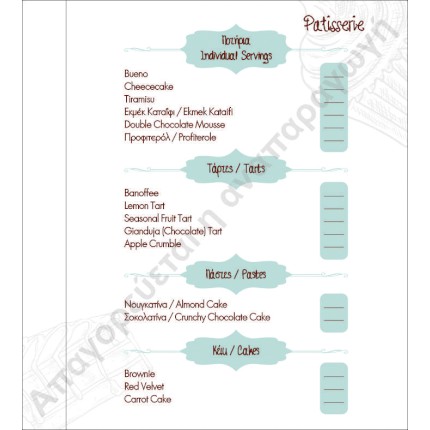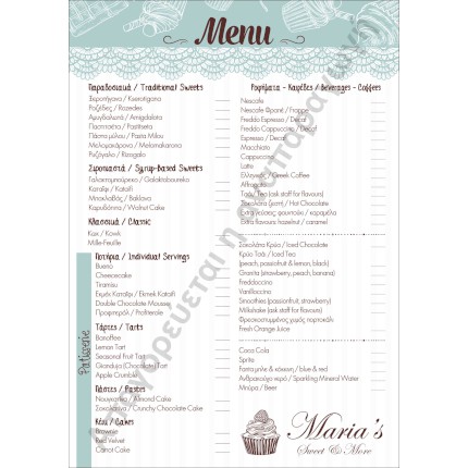 Τα γραφικά και το στυλ της γραμματοσειράς διασφαλίζουν την ευανάγνωστη παρουσίαση του μενού, που περιλαμβάνει ροφήματα, φαγητά και γλυκά. Αυτές οι λεπτομέρειες κάνουν τον κατάλογο cafe μία μοναδική εμπειρία για τους πελάτες σας.