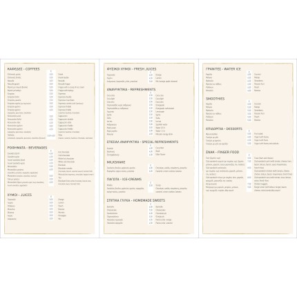 Η χρήση γραφικών και εικόνων αποτυπώνει τέλεια τα πιάτα και τα ροφήματα, κάνοντάς τα να φαίνονται ακόμα πιο ελκυστικά. Οι υψηλής ποιότητας εκτυπώσεις εξασφαλίζουν την καθαρότητα των λεπτομερειών, προσθέτοντας αξία και γοητεία στην εμπειρία των πελατών σας.