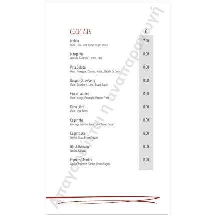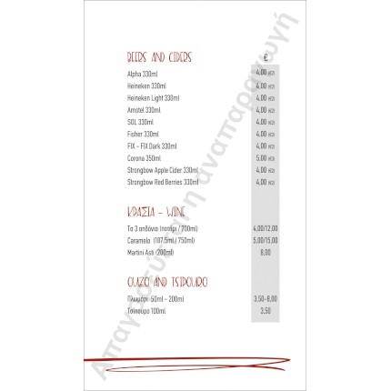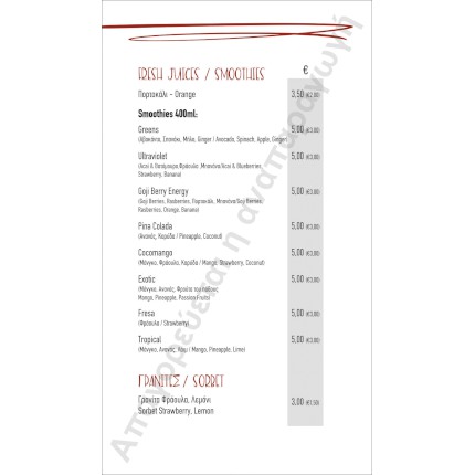 Οι εκτυπώσεις μας διασφαλίζουν υψηλή ποιότητα, είτε επιλέξετε ανθεκτικό χαρτί με πλαστικοποίηση είτε χωρίς. Αυτή η αντοχή εξασφαλίζει ότι ο κατάλογος cafe σας θα παραμείνει σε άριστη κατάσταση κατά τη διάρκεια της καθημερινής χρήσης στη καφετέρια.
