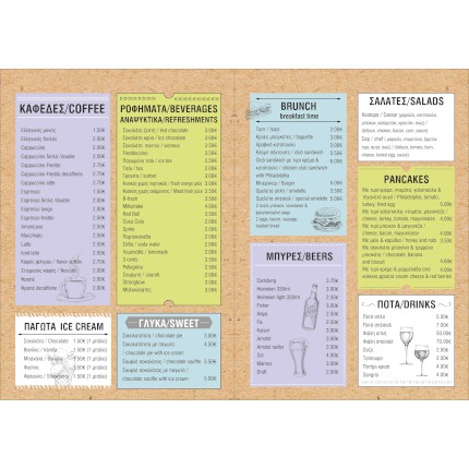 Τυπωμένος σε ανθεκτικό χαρτί με επιλογή πλαστικοποίησης, διασφαλίζει ότι ο κατάλογος cafe θα αντέξει στην καθημερινή χρήση. Η εκτύπωση υψηλής ποιότητας αναδεικνύει τα πιάτα, προσφέροντας μια μοναδική οπτική εμπειρία που μαγνητίζει τους επισκέπτες.