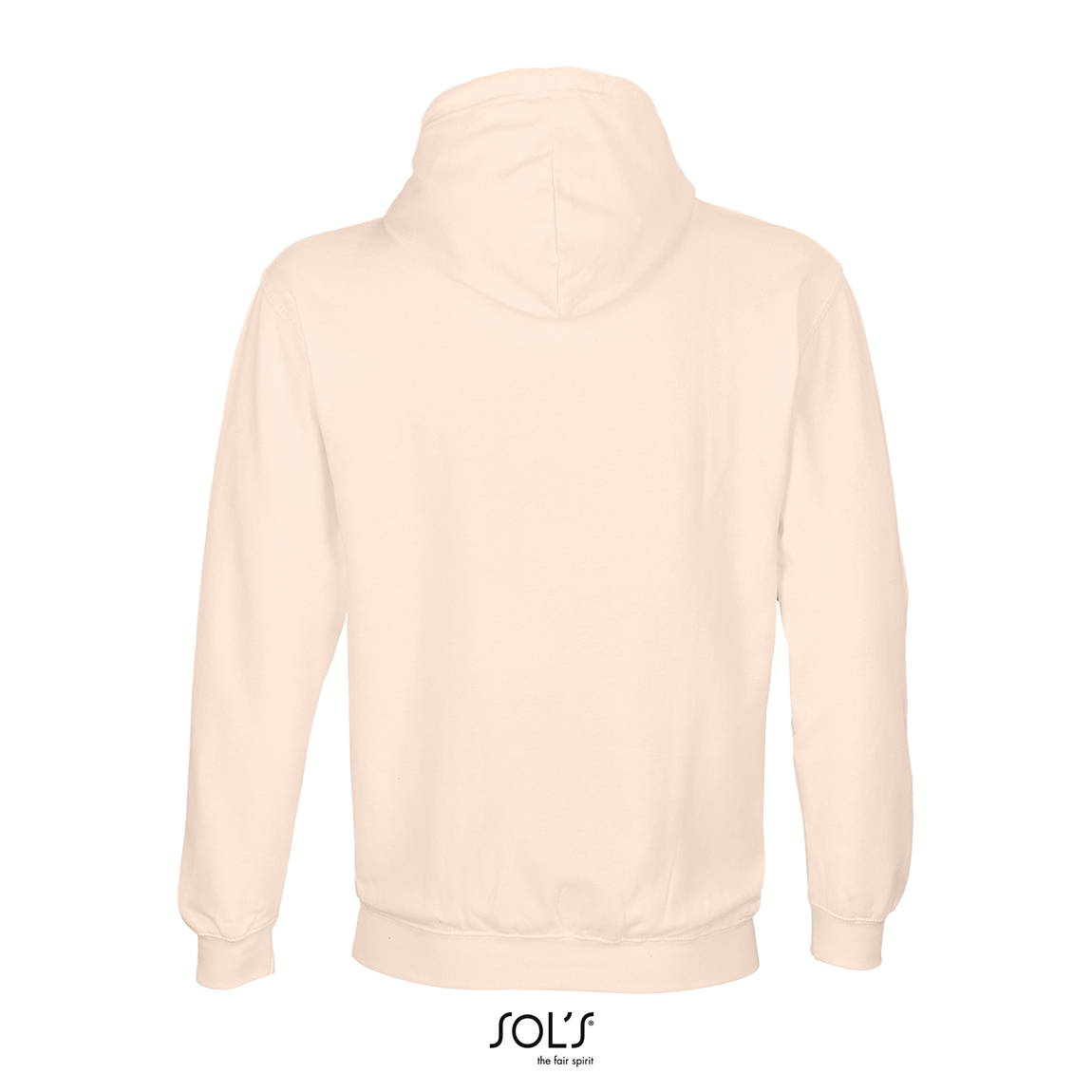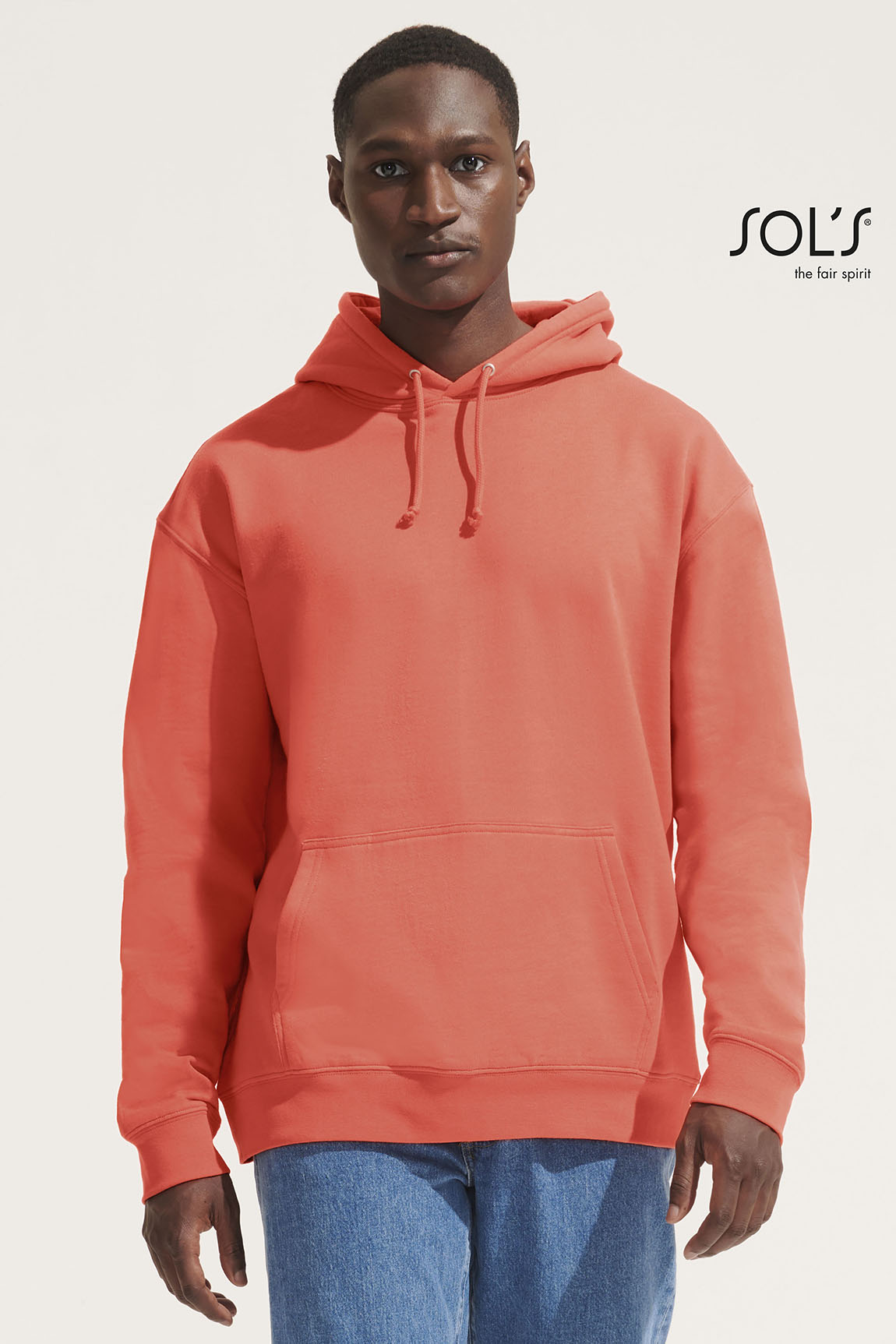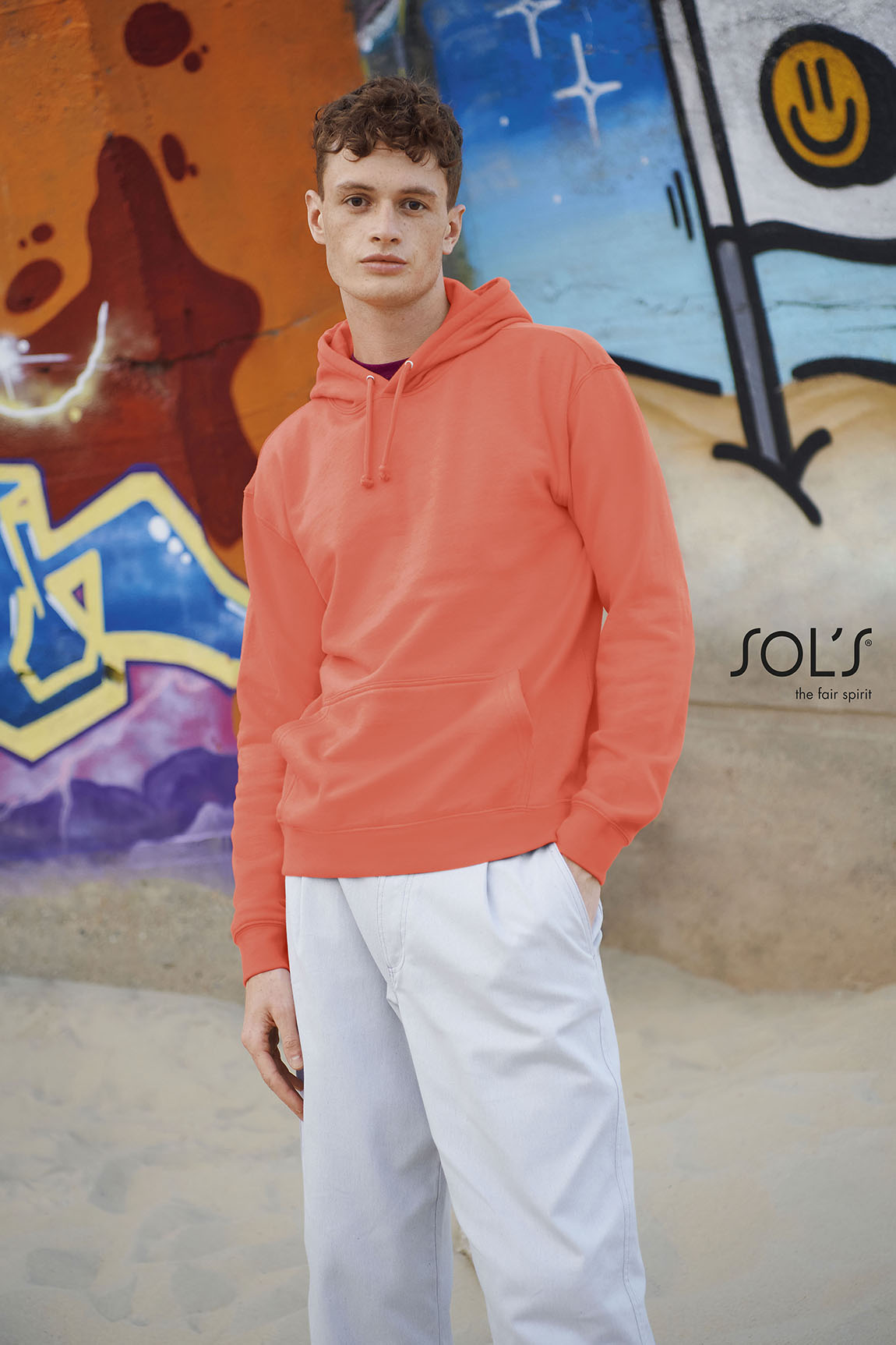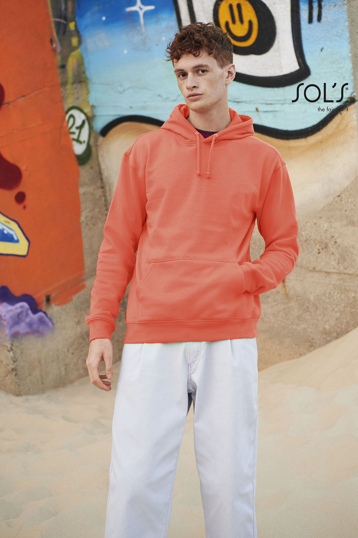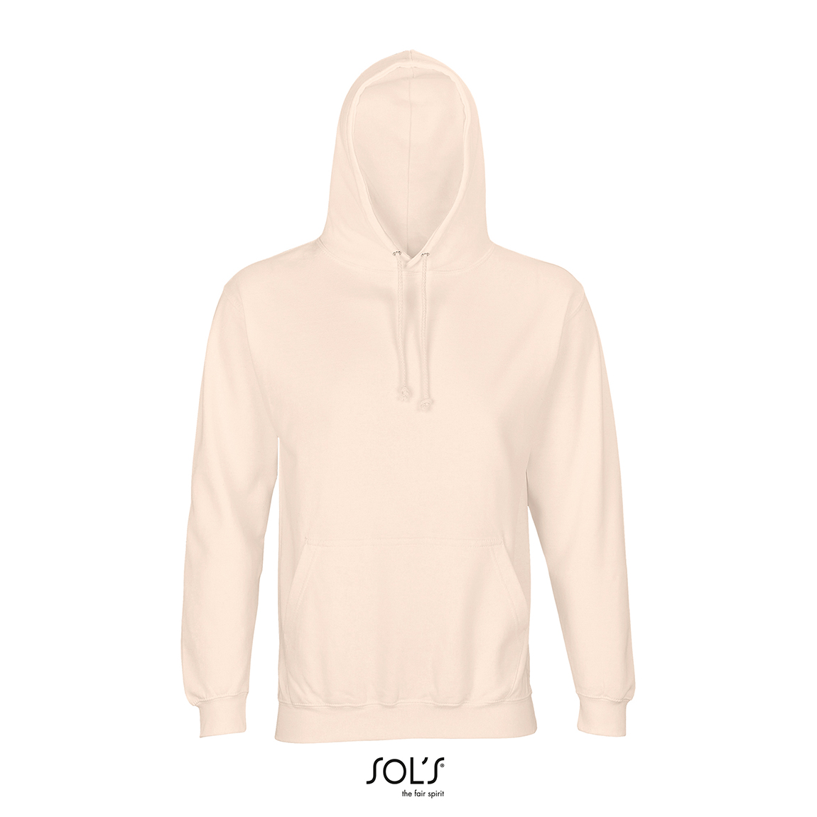 Σχέδιο και Χαρακτηριστικά: Πρόκειται για μια άνετη unisex μπλούζα φούτερ που διαθέτει πρακτικές λεπτομέρειες όπως πλαϊνές ραφές και μανικοκόλληση. Έχει ελαστικό ριπ 1x1 στις μανσέτες, το γιακά και τη μέση, καθώς και τσέπη καγκουρό για την αποθήκευση μικροαντικειμένων. Η επενδεδυμένη κουκούλα διαθέτει κορδόνι στον ίδιο τόνο με μεταλλικές οπές, προσφέροντας τόσο στυλ όσο και λειτουργικότητα.
