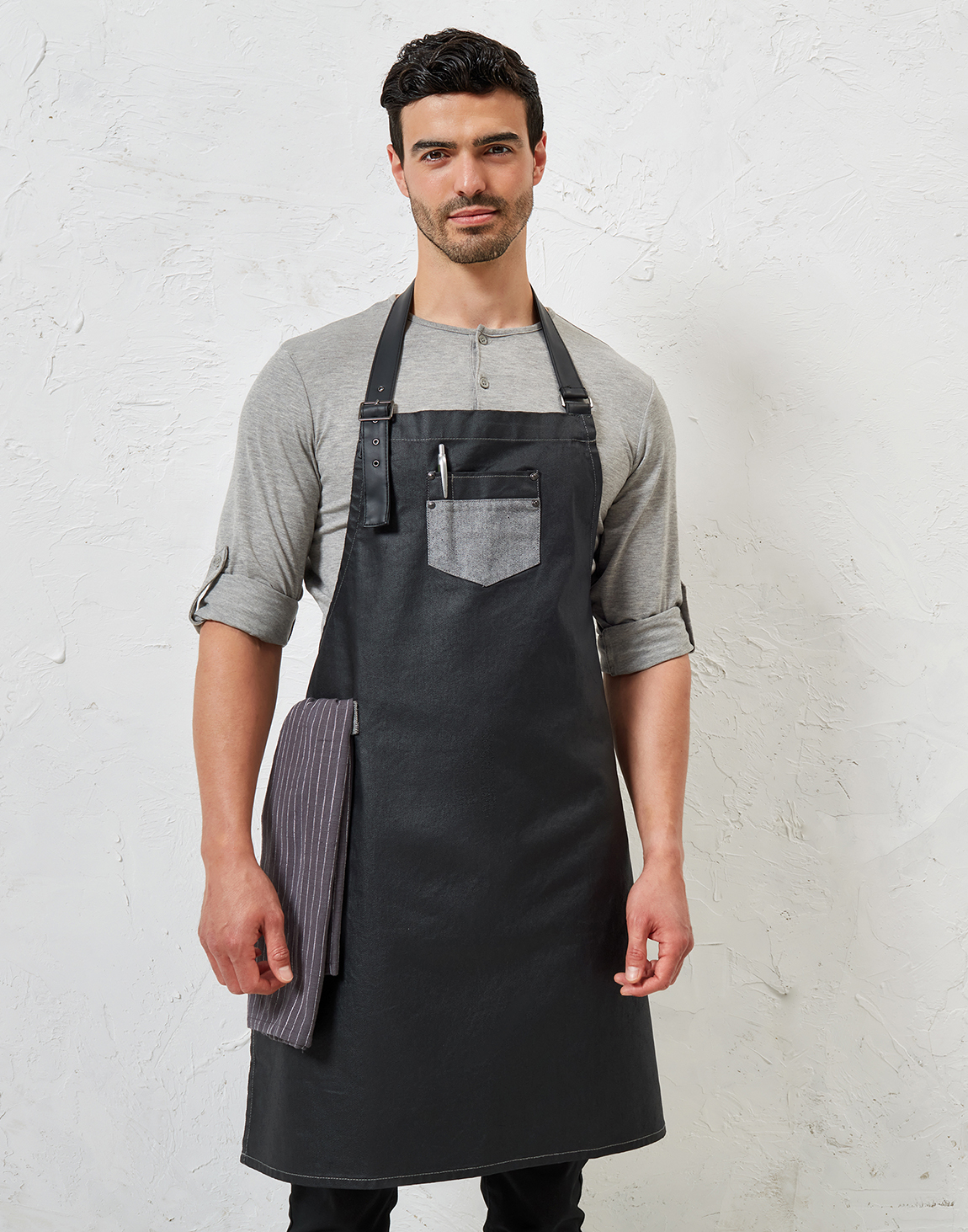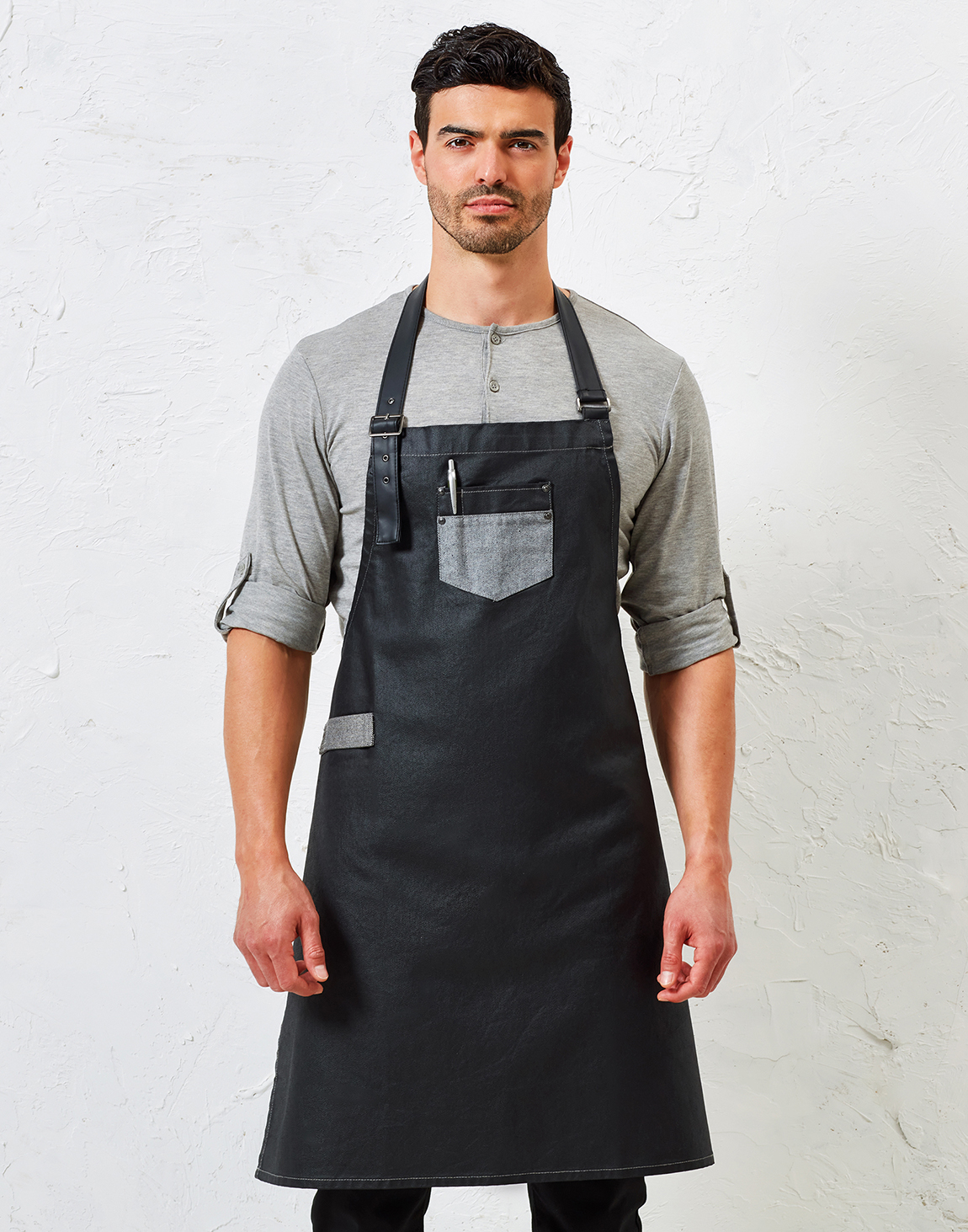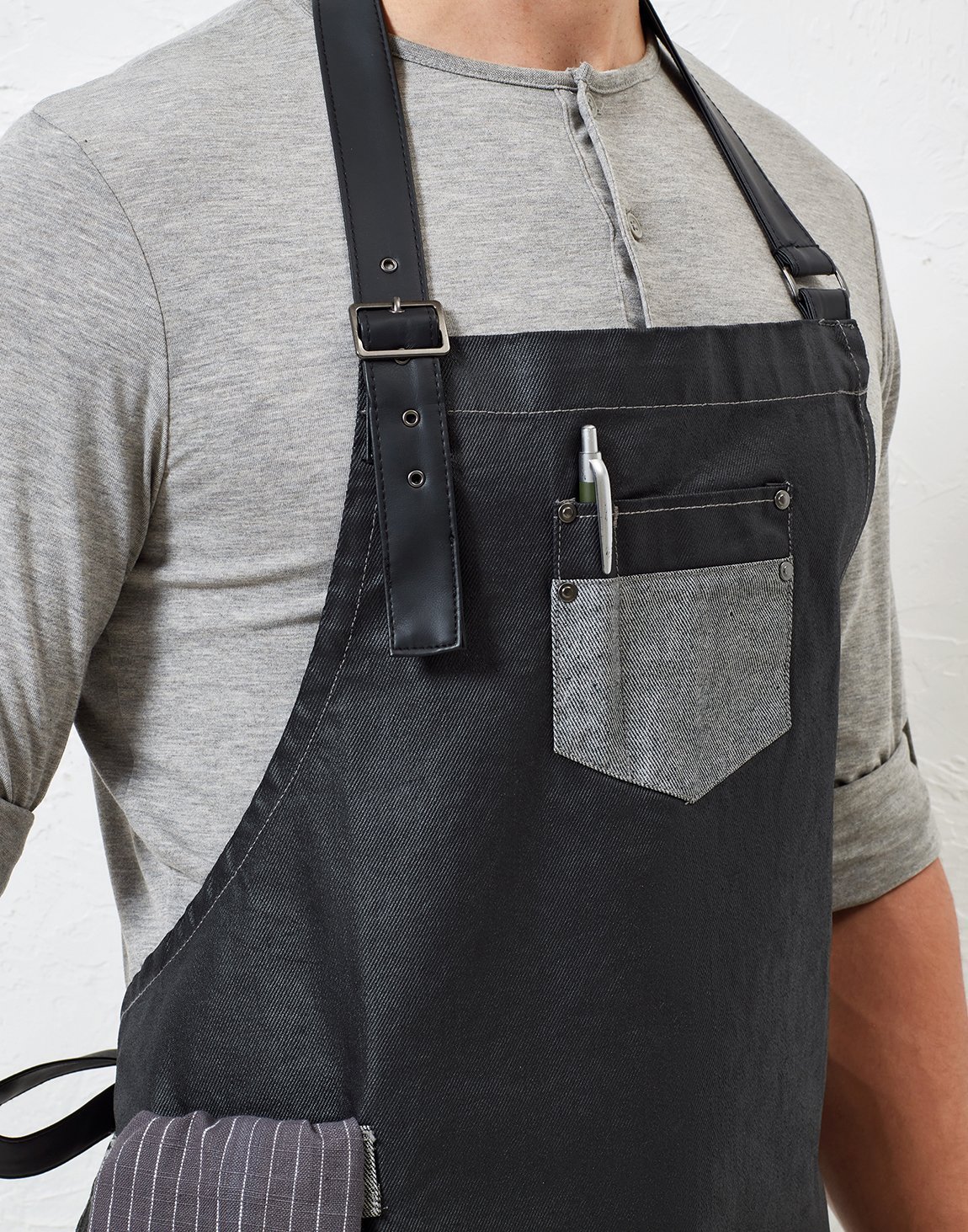 Περιγραφή: Ολόσωμη μακριά ποδιά έως το γόνατο, ιδανική για επαγγελματική χρήση. Διαθέτει λαιμόκοψη και δέσιμο μέσης από δερματίνη, με ρυθμιζόμενη λαιμόκοψη μέσω μεταλλικής αγκράφας. Ενώ μια μπροστινή τσέπη τζιν (13x13εκ.) με εξώραφα και θήκη για πετσέτα στο πλάι προσφέρουν πρακτικότητα και λειτουργικότητα.