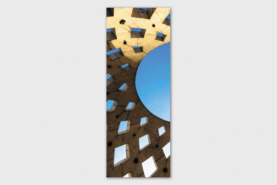Υφασμάτινο αυτοκόλλητο ψυγείου που απεικονίζει αρχιτεκτονικές λεπτομέρειες με γεωμετρικά σχήματα.