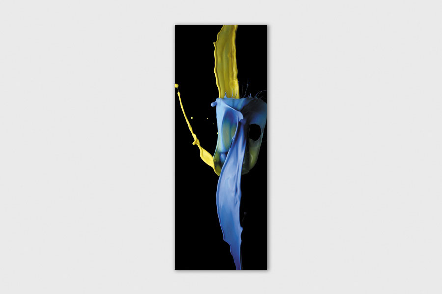 Υφασμάτινο αυτοκόλλητο ψυγείου που απεικονίζει κίτρινη και μπλε μπογιά στον αέρα σε μαύρο φόντο.