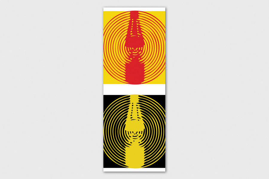 Υφασμάτινο αυτοκόλλητο ψυγείου που απεικονίζει δύο τετράγωνα, και μέσα τους ομόκεντρους κύκλους και ένα μπουκάλι.
