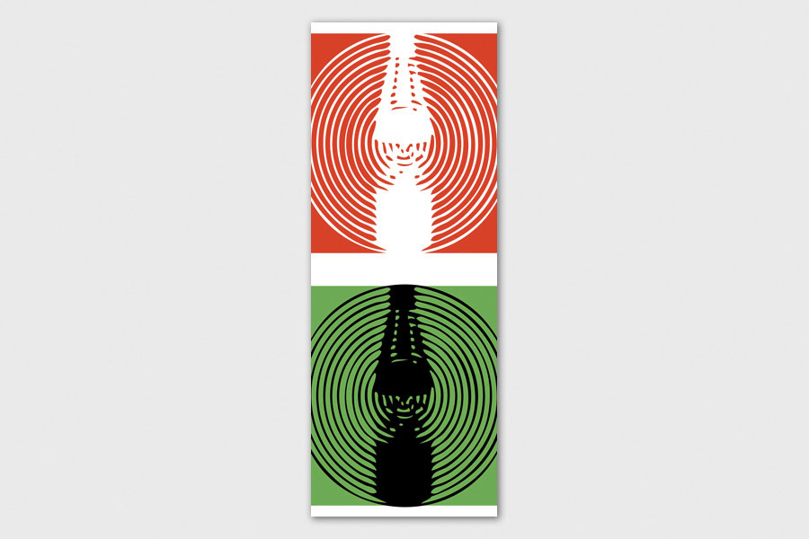 Υφασμάτινο αυτοκόλλητο ψυγείου που απεικονίζει δύο τετράγωνα, και μέσα τους ομόκεντρους κύκλους και ένα μπουκάλι.