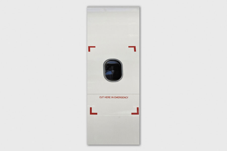 Υφασμάτινο αυτοκόλλητο ψυγείου που απεικονίζει ένα παράθυρο αεροπλάνου από την εξωτερική πλευρά με την ένδειξη "EMERGENCY".