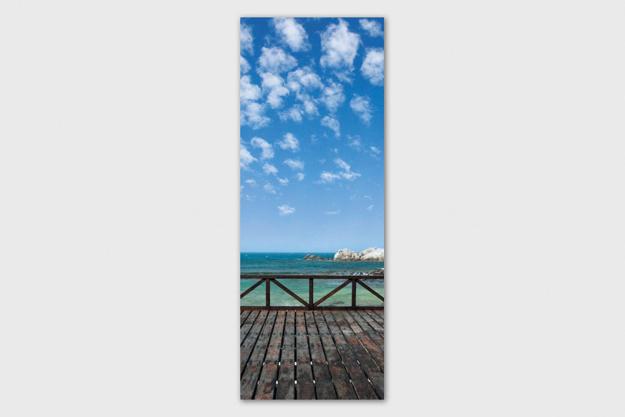 Υφασμάτινο αυτοκόλλητο ψυγείου που απεικονίζει μια ξύλινη βεράντα, με θέα σε όμορφα πράσινα νερά θάλασσας και γαλανό ουρανό .