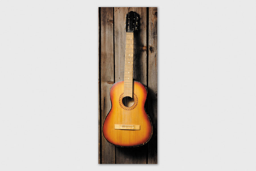 Υφασμάτινο αυτοκόλλητο ψυγείου που απεικονίζει μια κλασική κιθάρα πάνω σε ξύλινη επιφάνεια.