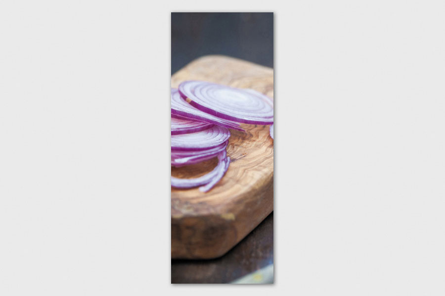 Υφασμάτινο αυτοκόλλητο ψυγείου που απεικονίζει κομμένες ροδέλες από κρεμμύδι πάνω σε ένα ξύλο κοπής.