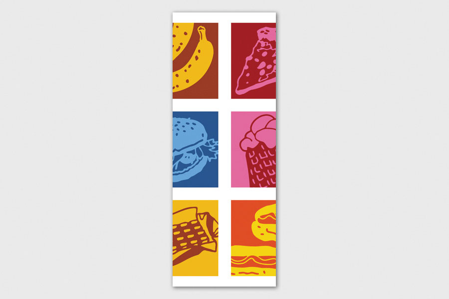 Υφασμάτινο αυτοκόλλητο ψυγείου που απεικονίζει έξι τετράγωνα με φωτεινά χρώματα που μέσα έχουν τα σχέδια παό διάφορα φαγητά όπωε πίτσα, μπέργκερ, παγωτό και άλλα.
