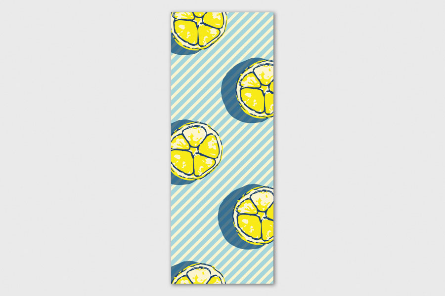 Υφασμάτινο αυτοκόλλητο ψυγείου που απεικονίζει σε σχέδιο, φέτες από λεμόνι με κίτρινες και γαλάζιες διαγώνιες γραμμές στο φόντο.