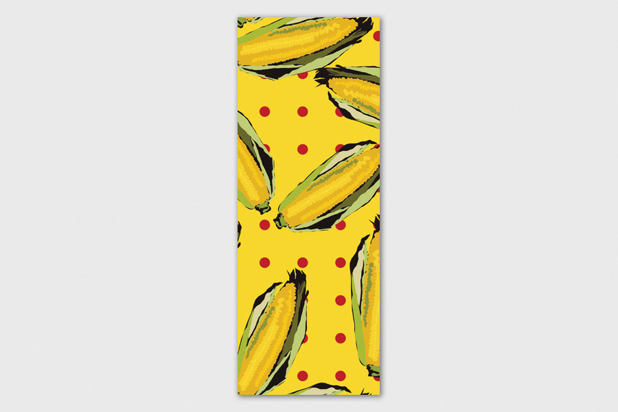 Υφασμάτινο αυτοκόλλητο ψυγείου που απεικονίζει σε σχέδιο,καλαμπόκια σε κίτρινο φόντο με κόκκινες βούλες.