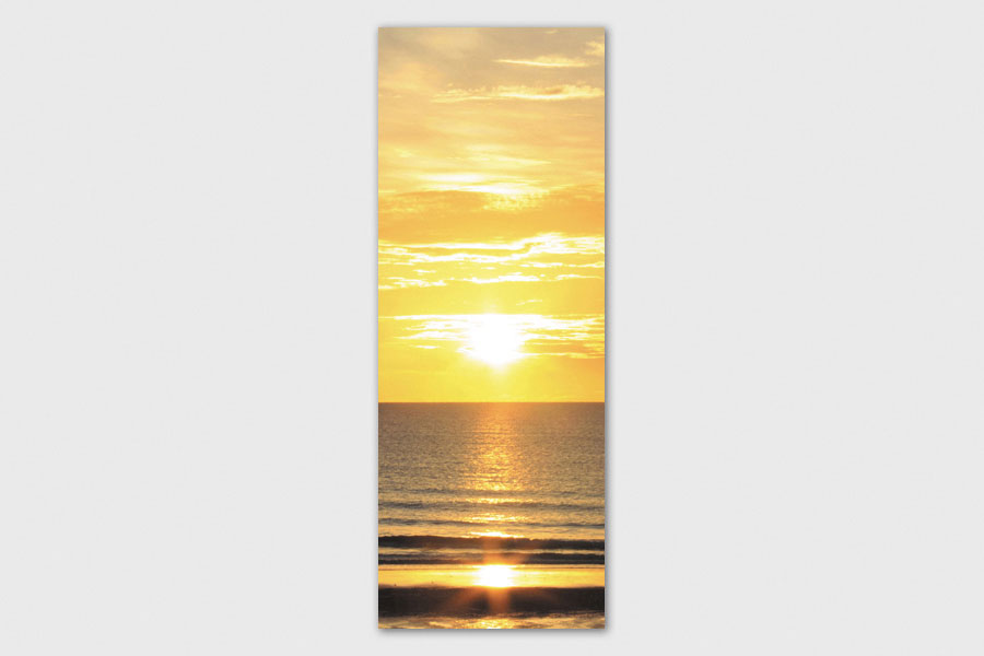 Υφασμάτινο αυτοκόλλητο ψυγείου που απεικονίζει ηλιοβασίλεμα ανάμεσα στα σύννεφα και πάνω από παραλία.