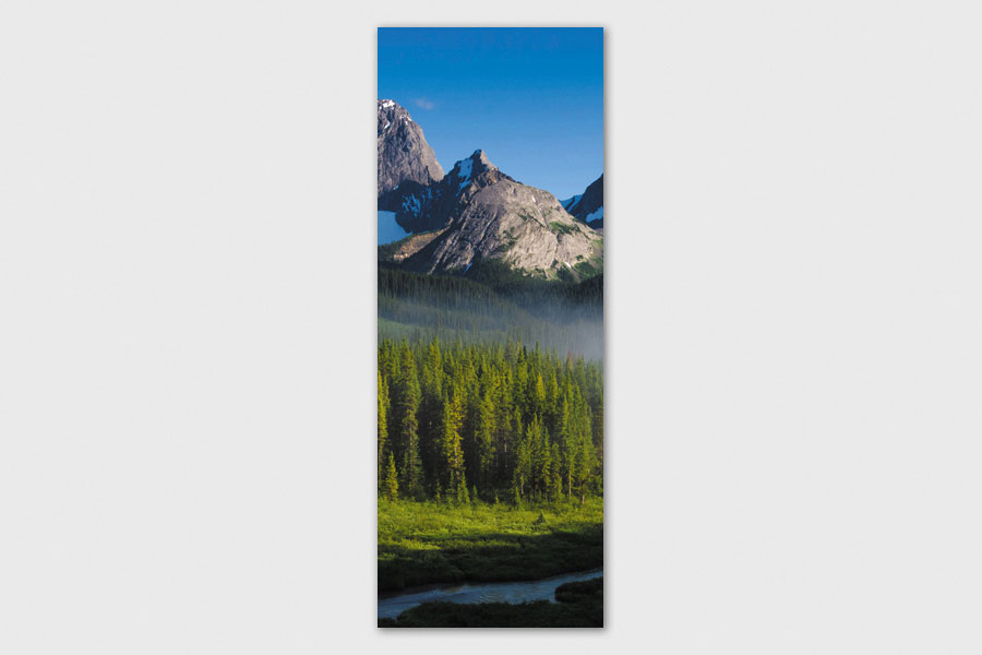 Υφασμάτινο αυτοκόλλητο ψυγείου που απεικονίζει μια χιονισμένη κορυφή πίσω από ένα δάσος.