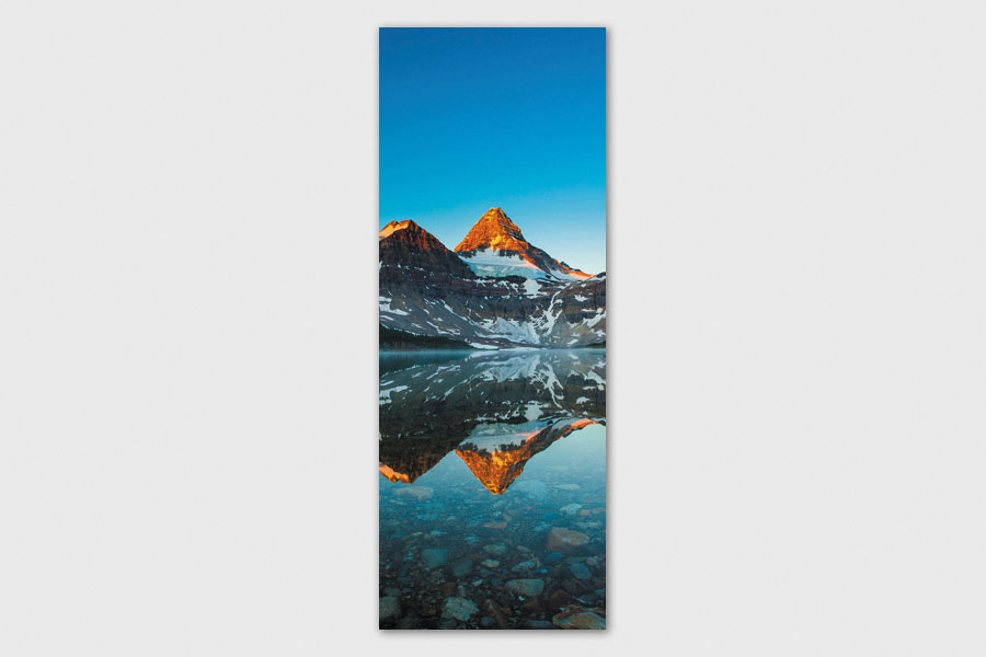 Υφασμάτινο αυτοκόλλητο ψυγείου που απεικονίζει μια χιονισμένη κορυφή με αντανάκλαση σε μια λίμνη.