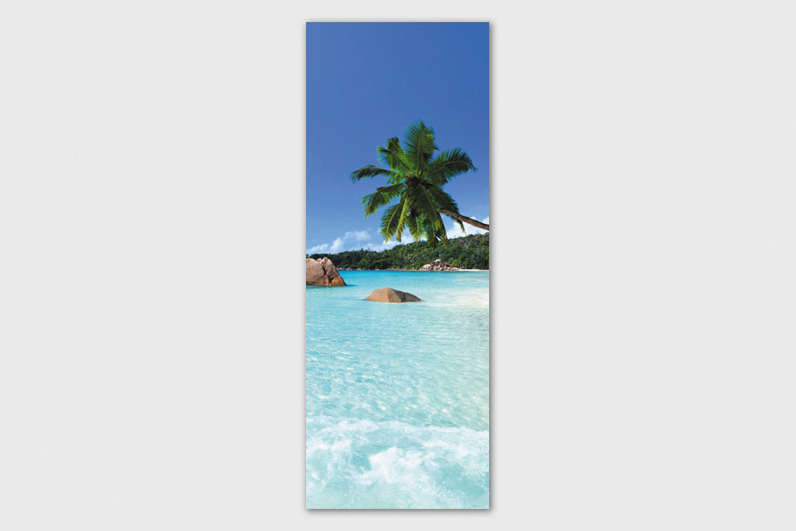 Υφασμάτινο αυτοκόλλητο ψυγείου που απεικονίζει μια εξωτική παραλία με έναν φοίνικα.